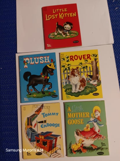 Five Tiny Tales books published by Whitman Publishing of Racine, WI:"Rover" 1949, “A Little Mother Goose” 1949, “Plush” (1949), “Tommy Caboose” 1950, and “Little Lost Kitten” in 1919. All the books have minor use but are in very good condition with no apparent marks or tears. Each book is 3.25"x4"x1/8in.